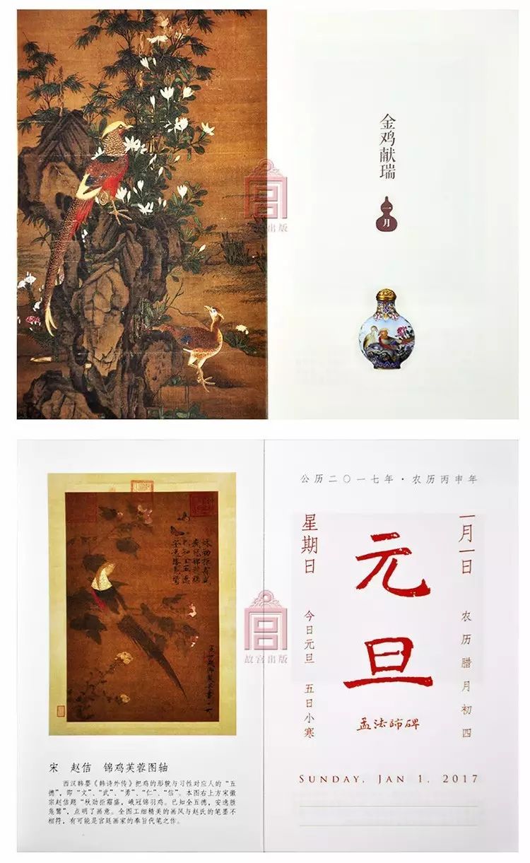 一月买日历绝不算晚,何况是兼具收藏价值的故宫日历。故宫出版社在农历鸡年,将包含鸡、凤、孔雀等禽类的各式藏品——玉雕、器皿、配饰、绘画——精心置于每一页日历上,配合文物注释,确保你珍视翻过的每一天。
