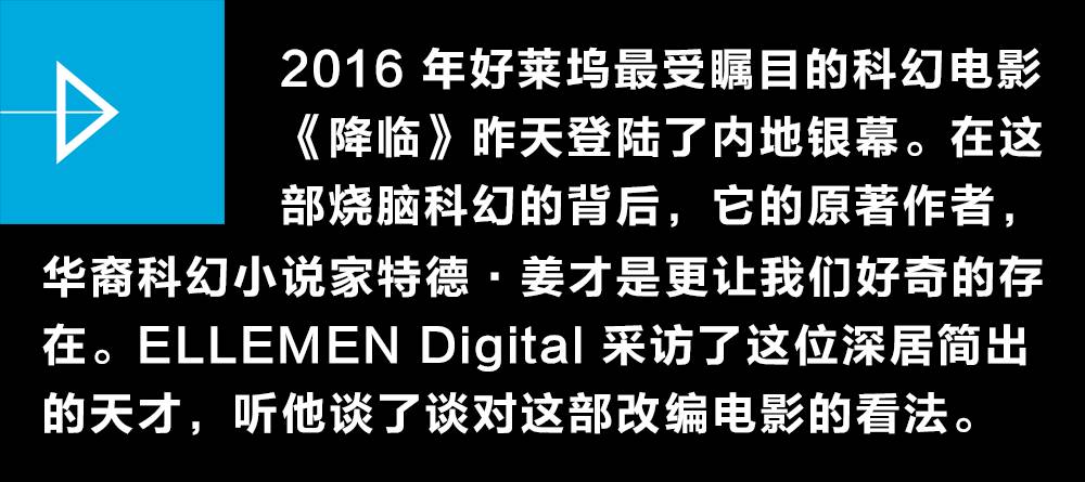 大概从去年年中开始,所有蜂拥而上,想要采访特德的媒体和我们抱的都是相同的目的——由他的短篇小说《你一生的故事》改编的《降临》成为了 2016 年好莱坞最受瞩目的科幻片,并于昨天在国内上映。