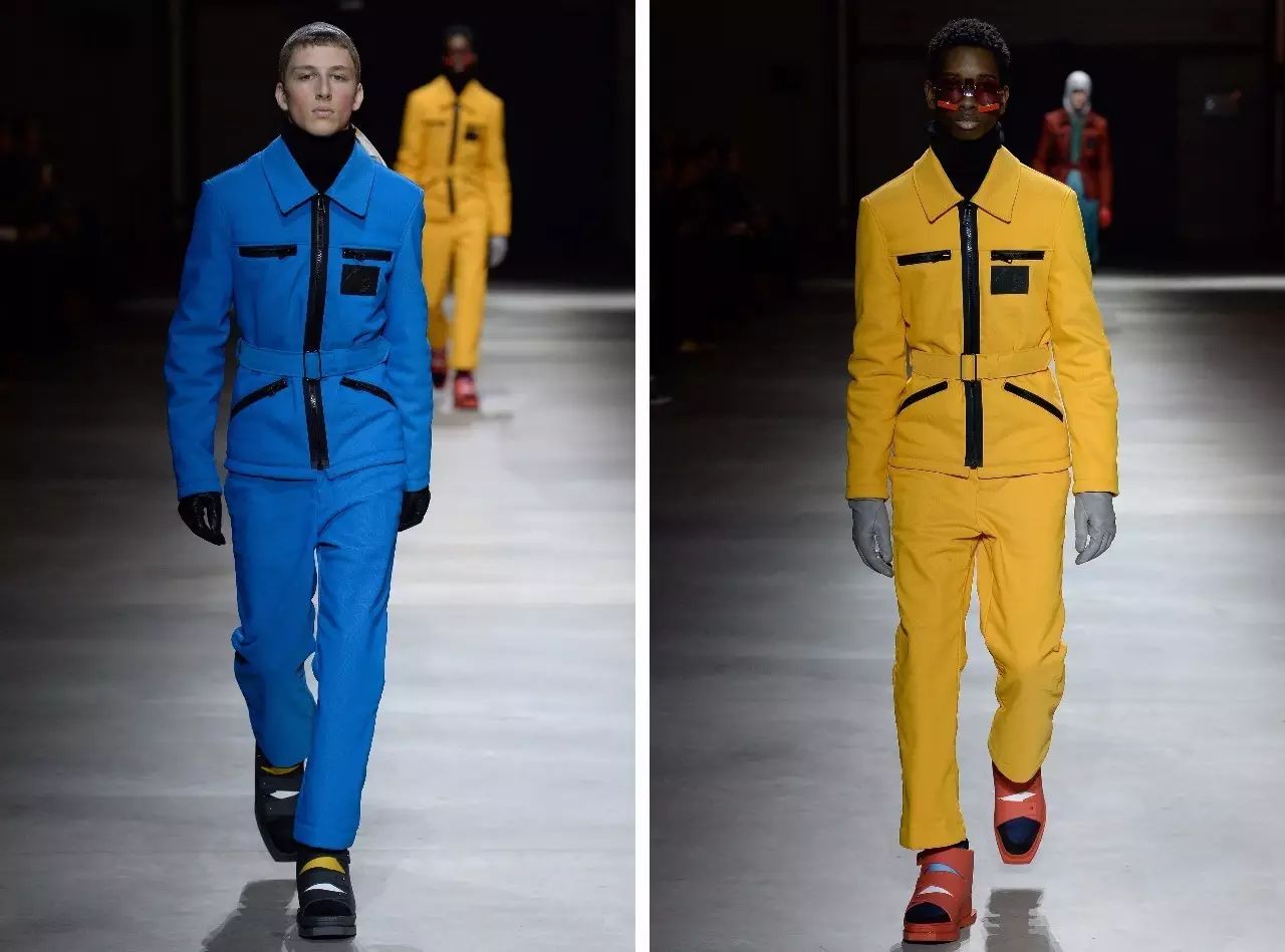 男、女装依旧同时发布,冬季蓝色和雨衣黄色成为贯穿始终的鲜艳色彩。