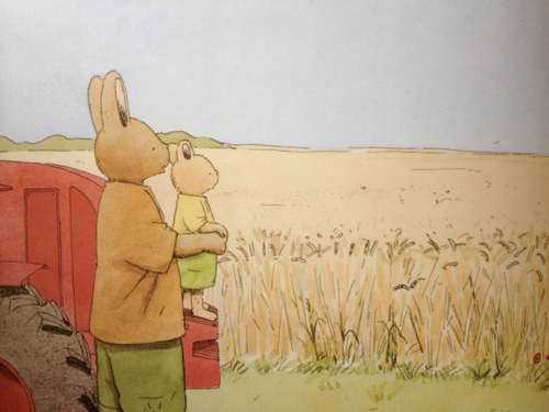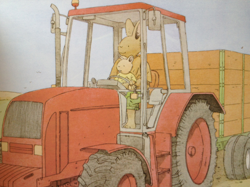 汤姆今天真高兴!他不去幼儿园,而是要和爸爸一起去乡下帮叔叔收割庄稼。看到这本书,最吸引我的一页是10-11页,爸爸扶着站在拖拉机上的汤姆,眺望着远处金色的麦浪……此时,好像有风向我吹来,那是秋天的风,凉爽,诗意。汤姆和爸爸的出现,使画面更美了:人亲近自然是多么美好的经历啊!现在的孩子,尤其是城里的孩子,太多的课业压力,太多的高科技产品和玩具充斥着他们的生活;如果父母能多抽空带孩子亲近自然、了解自然,体验不同的生活,他们能从中得到的东西远远不是我们能够想象的!
