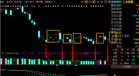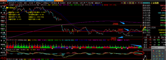 我们选取上证指数30分钟为例。从5月6日时局突变以来,指数运行的格局,基本是围绕2月25号的2805点的向上跳空缺口和5月6号的跳空向下缺口2890的中位平均2880,也就是图中红线的偏下位置反复围绕该点位反复运行的。