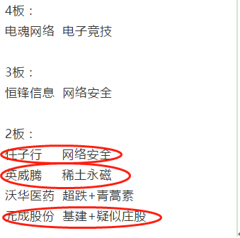 这个部分主要看看2板进三板的机会,看红色圈内的三只谁能晋级,个人比较看好任子行,今天对于网络安全板块又带动作用,今天他的大长腿打地洞了恒锋信息的回封。由于市场对高位空间股的吃面效应的延续,看其是否能完成卡位。4板的电魂网络是以游戏概念作为重要驱动,看是否能带动相关的游戏板块内的首版。暂时看不到板块效应,以独立走势对待,不建议接力做空间。市场本身也在压缩空间股。