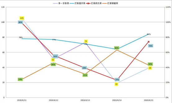 自然涨停板回归到6月以来的正常水平,跌停板却成环比增加的走势,证明市场俩级分化极为严重。炸板数量虽然减少,但是日内大面依旧不少,代表股神农科技。昨天2只3板进4的票晋级1个。6只2进3板的晋级3只。成功率还是可以的,证明弱势市场,市场对于低空间板块的晋级态度上属于抱团取暖的状态。
