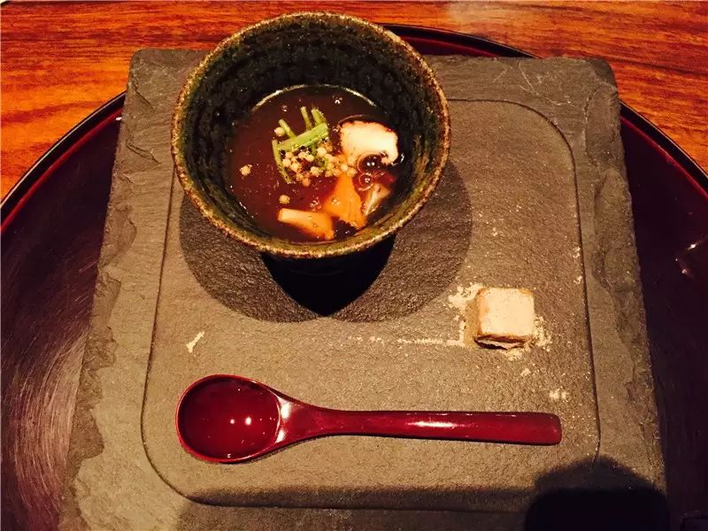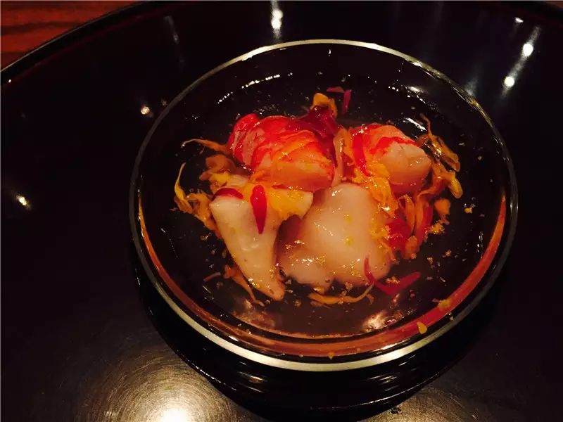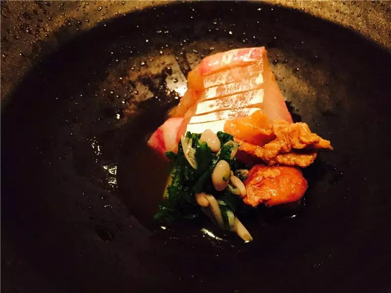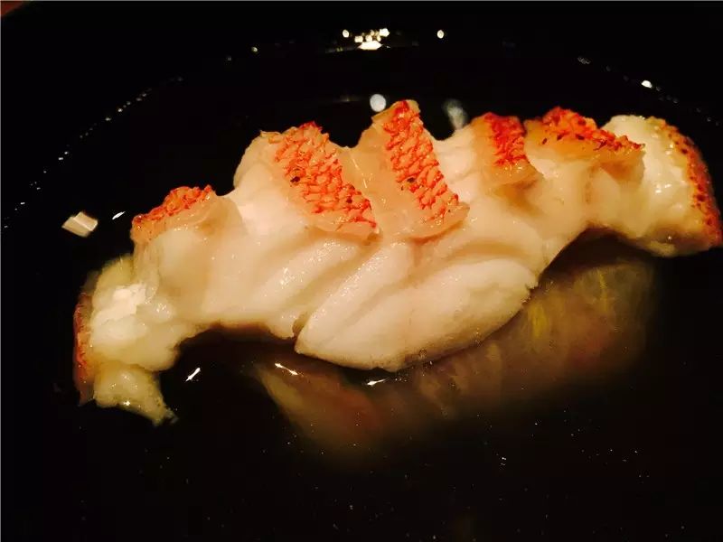 第二道煮物,以一番出汁(Dashi)为底,柚子调味。虽然清酒蒸制的Rose fish火候略过,但整体上以清淡的滋味为之后的菜品作了铺垫。置于底部的蔬菜包更是花了不少心思,内里有切成枫叶形的胡萝卜和生麸,凸显了秋季的主题。