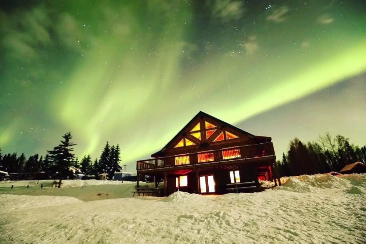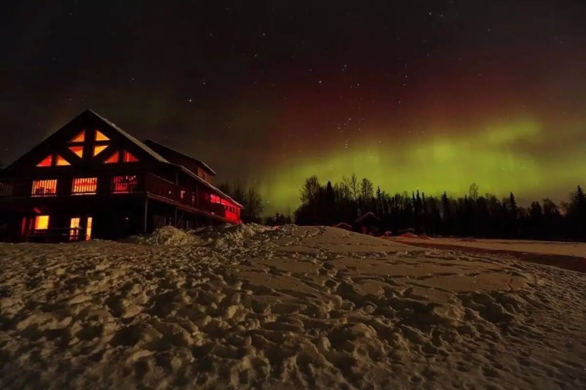 半个小时之后,我们到达了极光小屋。这个极光小屋之所以特别有名,很大一部分原因是因为它有一个台湾老板娘。据说很多年前这个小旅馆的老板还是一个单身的爱斯基摩男人,有一天一位从纽约来的台湾女客人住进了小旅馆,和店长聊得甚欢。几瓶啤酒下肚,便喝出了感情。几个月之后,他去纽约看望这个在他小旅馆下榻的女客人,又是几瓶啤酒,就把这个姑娘带来了阿拉斯加,成了极光小屋的老板娘。