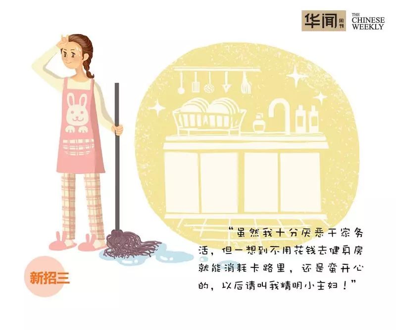 一直觉得做家务是件很烦心的事情?No!家务可是一项非常直接的消耗卡路里运动。涮洗碗碟、熨烫衣服、擦洗地板、整理鞋柜……每干1个小时的家务活可以帮助你消耗掉300卡路里。同时,你还能拥有一个洁净整洁、闪闪发光的家,谁说鱼和熊掌不能兼得?不是只有激烈的锻炼才是燃烧卡路里的必要手段,缓和运动也足以维持身材。