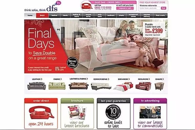 要说常年打折又屡做宣传广告的品牌,非英国沙发连锁商店DFS莫属。它的惯用伎俩是经常打出“快行动,打折周日截止”(Hurry! Our sale ends Sunday)的标语,但是过了截止日又开始新的打折,就这样周而复始直至下一年。由于一年中大部分时候DFS都在打折,所以它被英国消费者戏称为“打折从不停止”(Sales never end)的品牌。