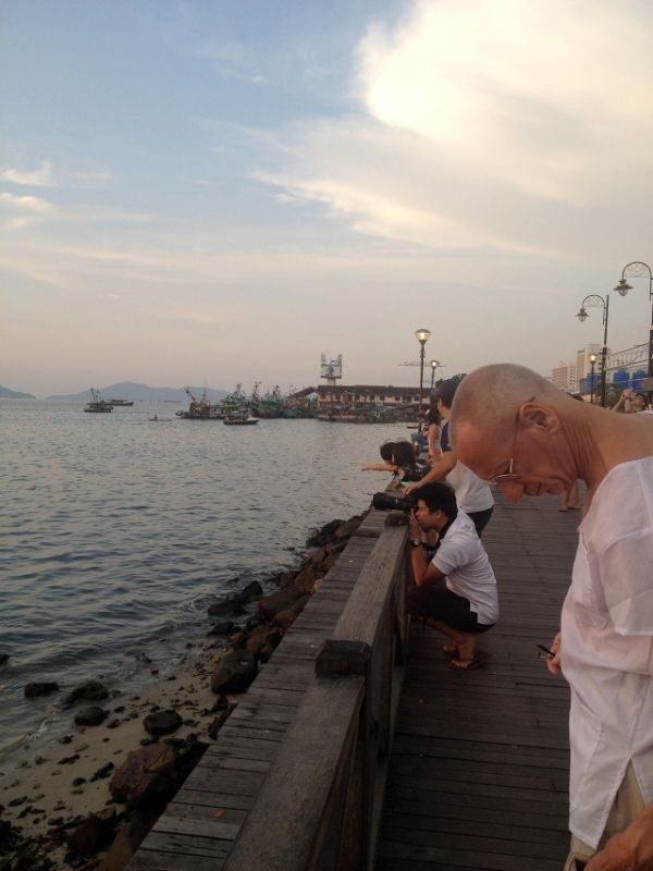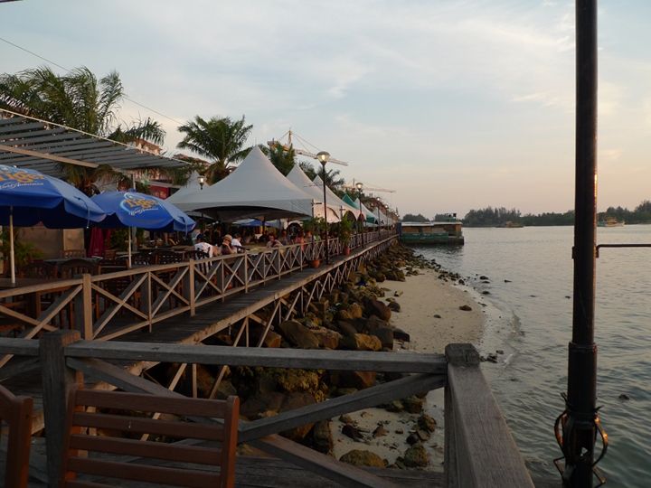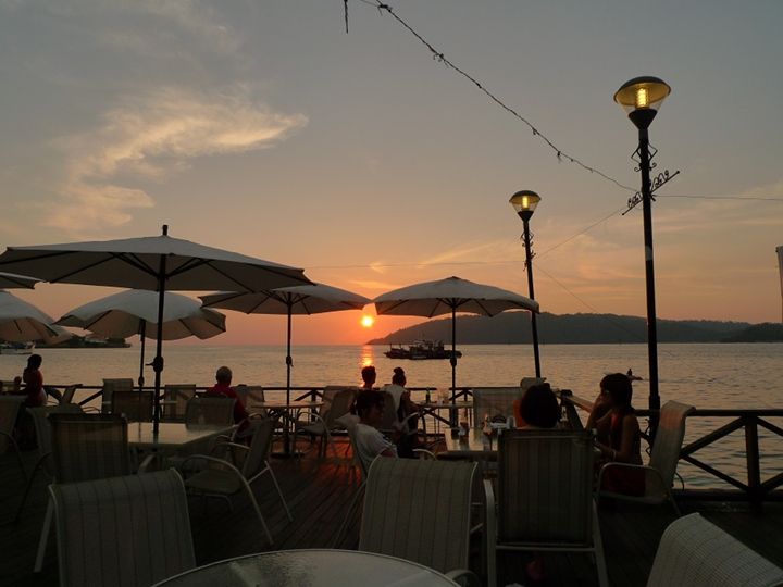 可惜逛完market时间太晚,只能去一个岛屿,而且事实是做为一个孤身旅行的人,旅行社只愿意带我去一个岛屿, 我只好失望滴逛逛街,然后去waterfront看kk市区的夕阳,水边林立的咖啡店和餐馆,已经坐了不少游客,也有人或者拿着大炮筒,或者手拉着爱侣守候这落日