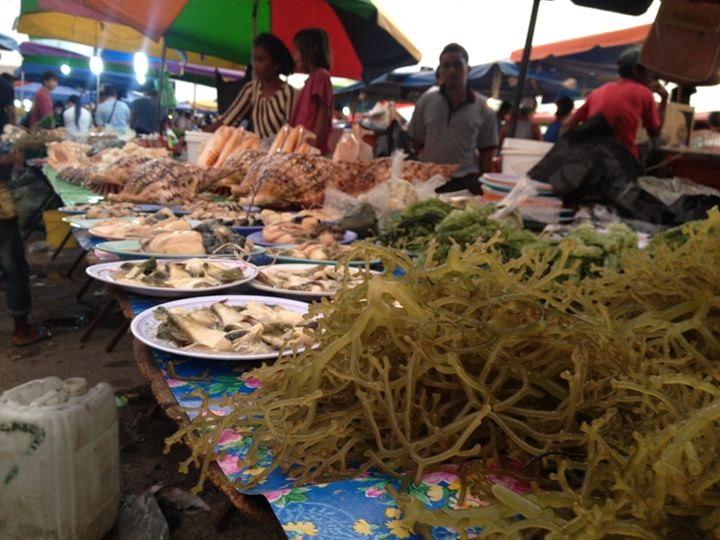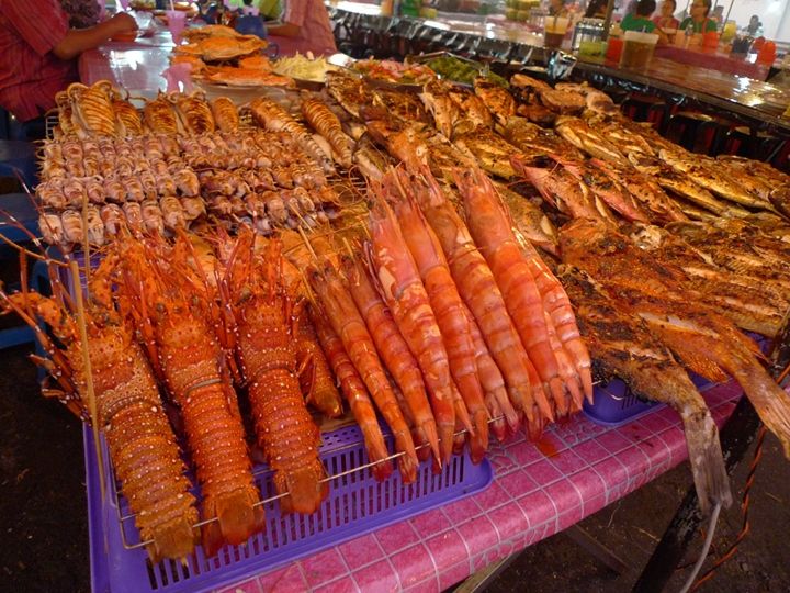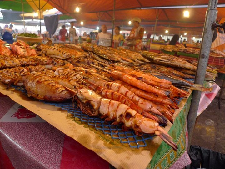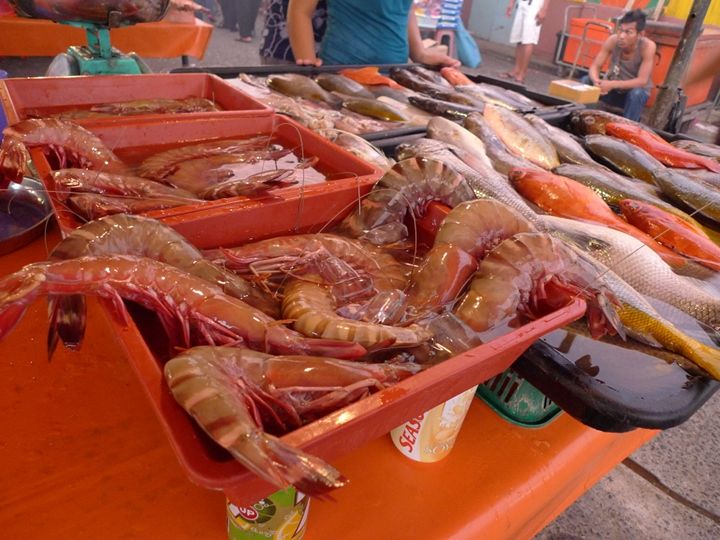 waterfront旁边紧挨的夜市正热火朝天,除了蔬菜水果,更多的是海鲜鱼类,已经现买现做的海鲜摊子