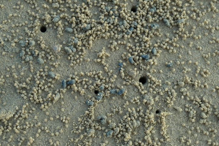 小小的螃蟹和寄居蟹在沙滩上绘制了可爱的图形