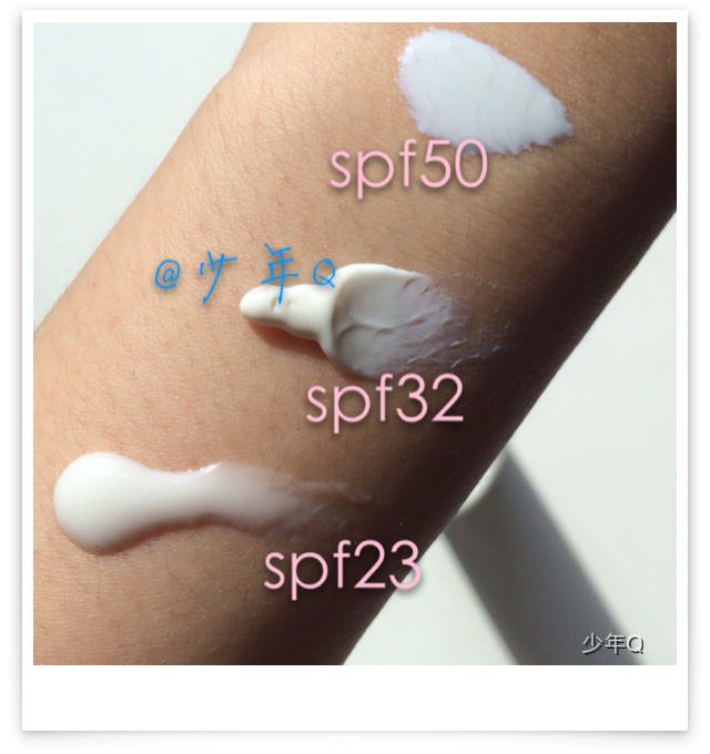 三款质地如下图,spf23是清爽的啫喱乳液,spf32是面霜质地,spf50是日系最常见的涂改液质地