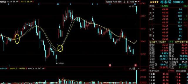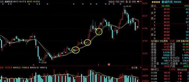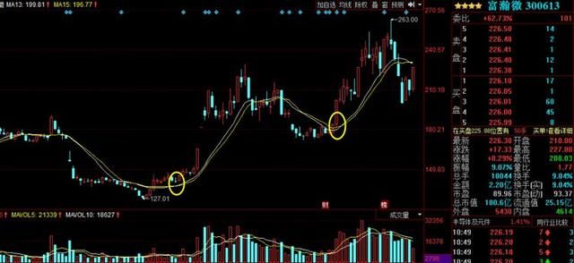 前提条件,13日均线上穿15日均线形成金叉,13日均线向上。说明目前股票处在上升趋势。绿灯通行。理论上,股价每次回探13日线就是机会。但是实战过程中,多数情况下,股价会选择盖在13日线上,所以这时候就需要利用15日均线来进行判断,当股价跌破15日线时,那就意味着本次支撑不成功,股价会继续往下走。