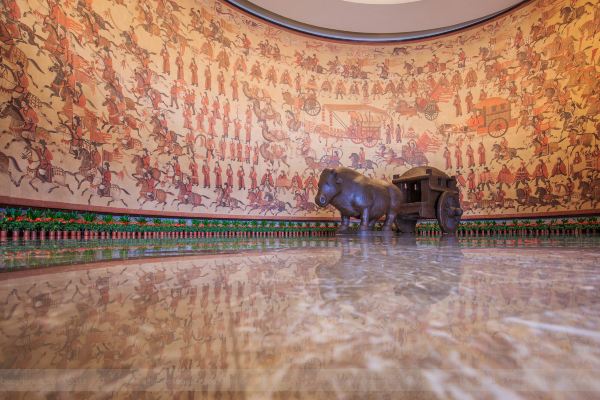 有趣的是壁画前的铁铸雕塑《牛车》,取材于北魏宋绍祖墓出土的牛拉鐅甲车,健壮有力的牛,和圆形的车,带有鲜活的北魏气息,让观者进入到大同历史上最辉煌的百年——北魏都城平城时代。