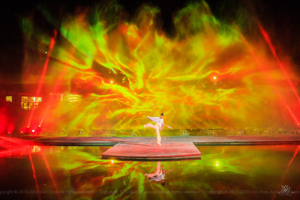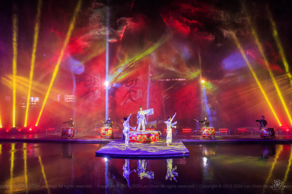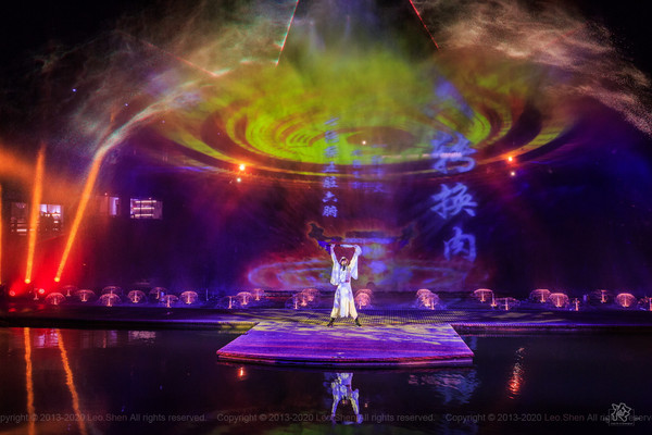 水中倒映着绚丽的景象,音乐时而激荡时而舒缓,呈现出一幕幕气势磅礴的视觉盛宴