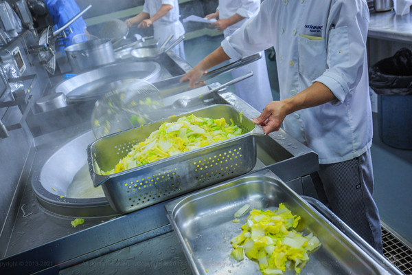 整个厨房是开放的,也是为数不多的允许拍摄的区域,在这里可以看到这里的菜品都是由澳门航空米其林级厨师团队亲自炒制而成,对于食材烹饪的时间、调料的配比、出锅前的温度有着严格的规定,以保证每一个航班的每一位乘客所吃到的飞机餐的口味都是基本一致的,这一点看似容易,其实是非常难的,正所谓差之毫厘失之千里,一切的尺度完全都掌握在大厨和各种测量仪器的手上。
