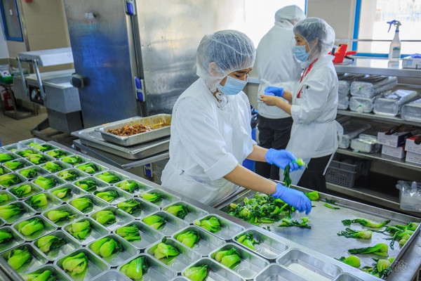 随后这些完成加工的菜品会被送到包装区,每一份餐食蔬菜、荤菜、米饭的配比同样有着严格的标准,每一位操作人员早已心知肚明,摆放起来的效率也是相当的高。