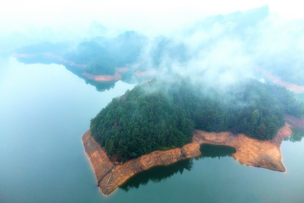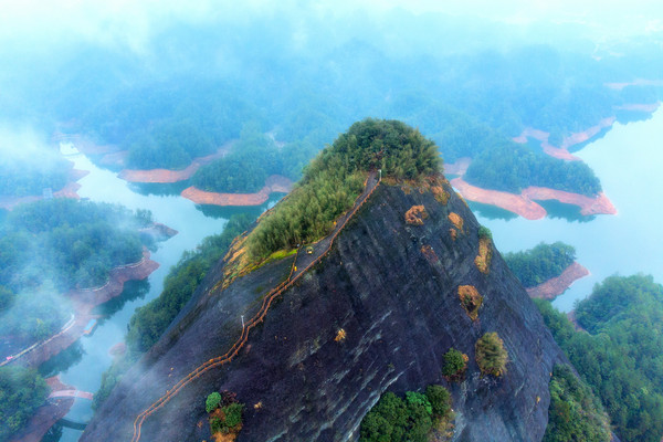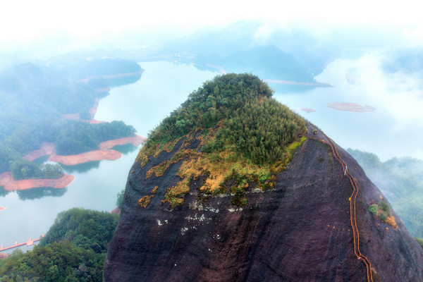 铜鼓天柱峰,又名灵石尖,海拔359米,此峰屹立于江西五大河流之一的修河上游大煅水库西岸,“一柱擎天入画图,亭亭壁立锁烟孤”,有“修江第一峰”美誉。