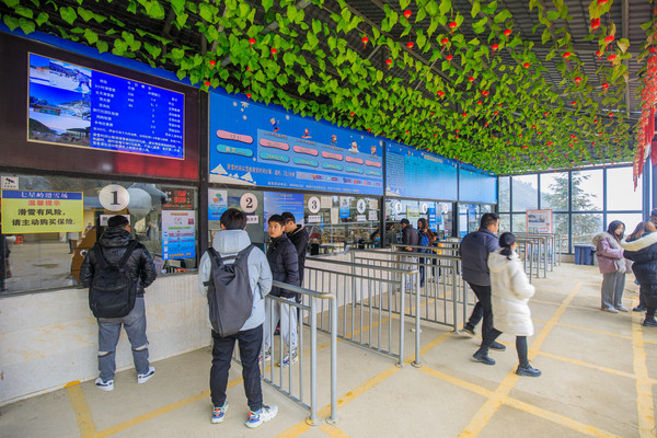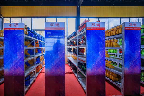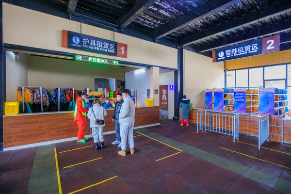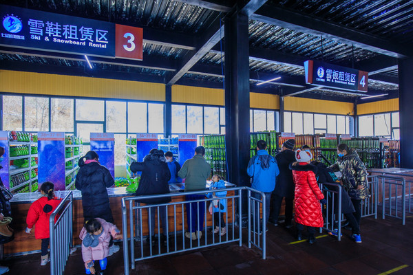 在游客大厅,游客们依次排队购票,领雪靴、滑雪杖、滑雪板等装备。
