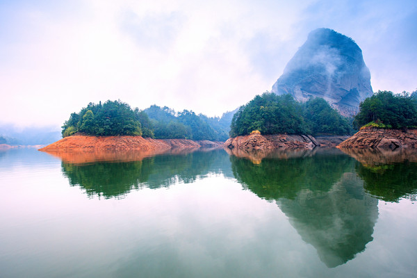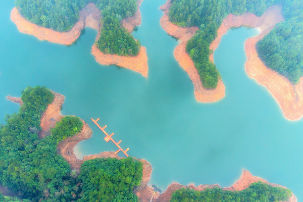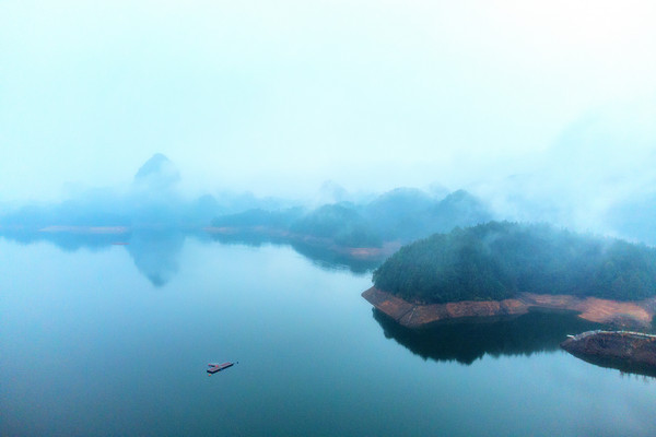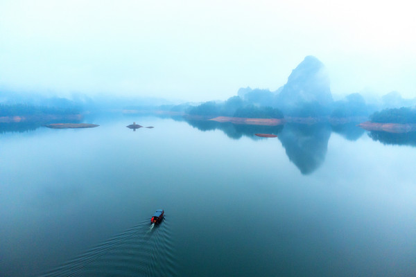 秀美的九龙湖湖面碧波荡漾,两岸山峰奇巍险峻,乘坐画舫游湖,好一副“舟行碧波上,人在画中游”的美景。
