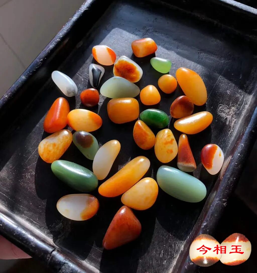长期沁泡在河水细沙中的和田玉,在水流和水中气体的作用下,氧化铁逐渐沁入形成皮色,同时又因为其它矿物元素含量的微妙差异而呈现出多样化的色彩。在氧化铁和矿物元素累积的过程中。沁染并不十分均匀,有正背前后的差异,有的像散点,有的局部聚集,有的完全包裹,形态万千。