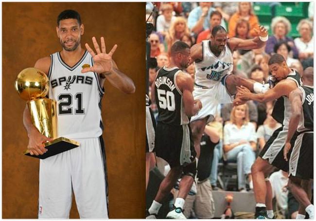 蒂姆-邓肯职业生涯获得:5次总冠军(1999,2003,2005,2007,2014),2次常规赛MVP(2001-02,2002-03),3次总决赛MVP,15次全明星,15次最佳阵容,15次最佳防守阵容。生涯场均数据:19.3分,10.9篮板,3.1助攻,2.2盖帽,50.6%投篮命中率。