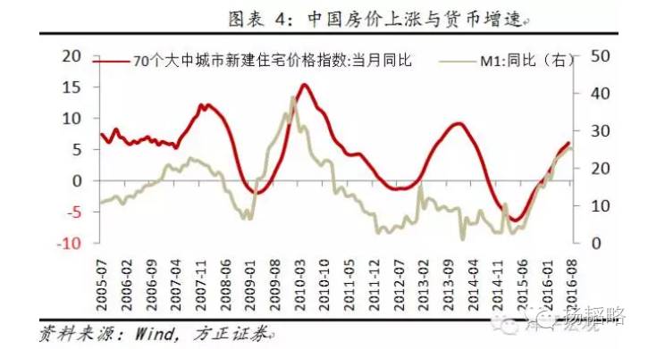 这张图意在表明,中国的房价与货币供应量是正相关的。尤其是最近这一轮房价上涨,与货币增速几乎就是完全正相关的。