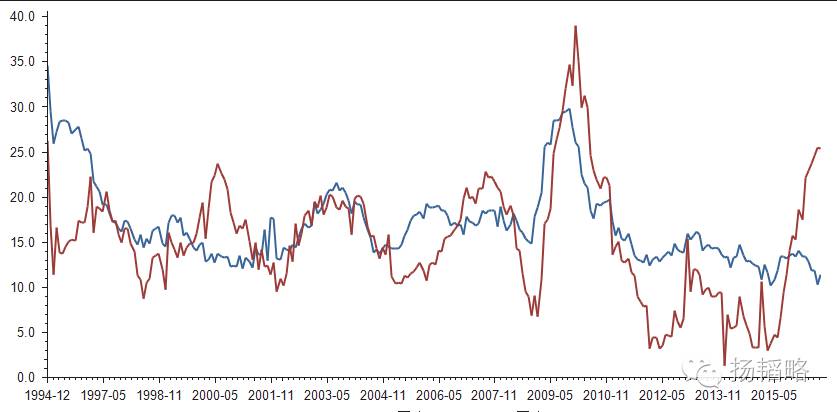 2001年到2015年的长达15年时间里,M1和M2是如影随形的,基本没有出现大的偏差。M1强于M2的时间有三个节点:其一是1995年之后的一段时间里。当时存款利率下行,企业活期存款增多,可以解释一部分原因。到2001年之后,二者才重新同步。这段时间,爆发了中国股市第一轮牛市,而房市在这段时间其实相对萎靡不振。