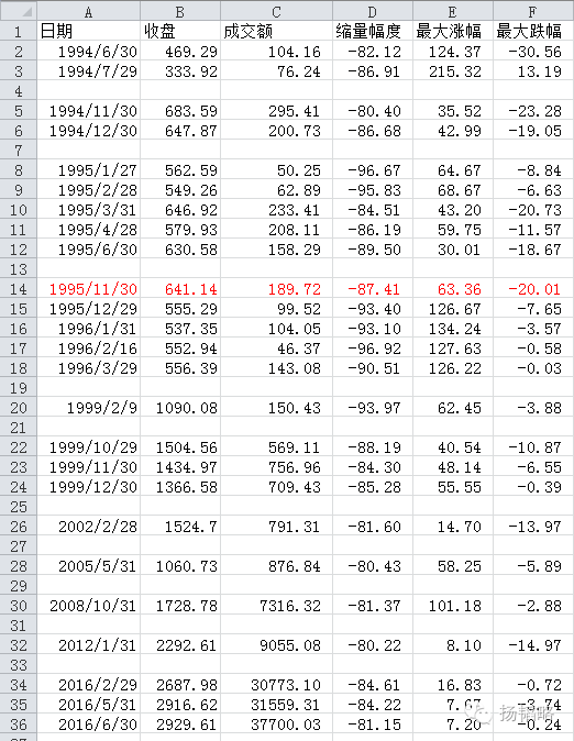 这张表列出了历次持续缩量的过程。2016年以来已经有三个月缩量了。9月预计是第四个月,如果不出意外,10月很可能是第五个月。现在的行情,就越来越像1995-1996年的缩量过程了。