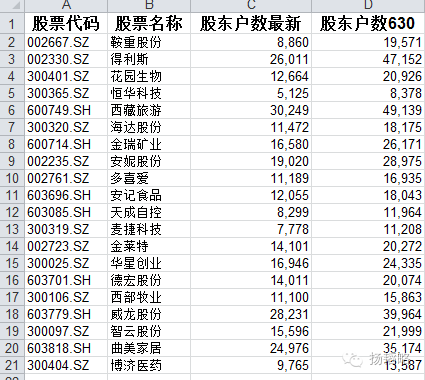同样道理,股东户数下降较多的股票,如果价格涨幅还不大,则可以考虑在下一季度配置。这些股票的名单如下(从前100名中精选20只):