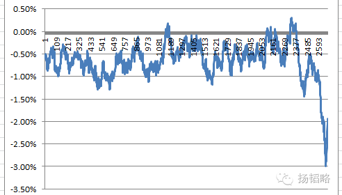 看下面这张图,横坐标从左到右,是市值从小到大。纵坐标则是今日涨跌幅的数据。颇具讽刺意味的是,市值无论大小,涨跌幅度其实都是在0.6%前后,但市值最大的一组股票,跌幅急剧扩大到3%!注意,这个数据是50只股票的均值。