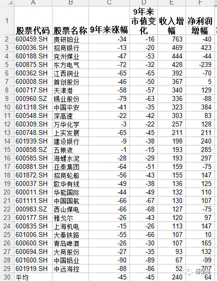 关于超跌股,今天重新做了一下加工,从各个不同行业的角度审视超跌股票。选择的是2007年9月30日有市值的股票,再挑选9年来股价或者总市值是下跌的股票,对比其间的收入和利润情况。结果如下图: