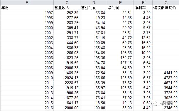 看看这个表,我右边特地列上了这几年上海期货交易所的螺纹钢年交易均价,大致可以反映出钢铁市场的价格波动情况。在钢材价格回到历史低位的时候,宝钢的利润能有如此突破,实在难得。