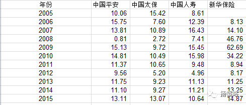难得的是,中国平安的净资产收益率是各大保险公司里较高、最平稳的。下表是2005年以来各大险企的净资产收益率数据。