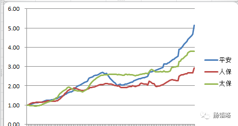 如图是三大险企2005年以来的寿险业务保费收入变化情况。太保的增速相对慢一些,平安和人寿强势不改。