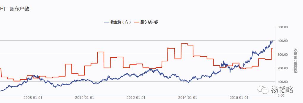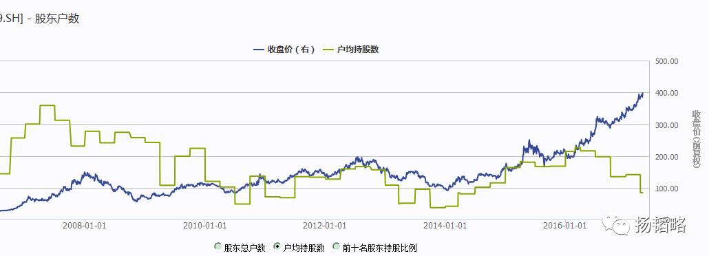 这是2001年以来持有茅台的机构投资者每家持有的茅台市值趋势图。2008年一季度的时候,机构持股均值曾达到每家3.8亿元,时间是2008年一季度。而去年底的时候,机构在茅台上的每家持股市值是2700万元,比8年前少了9成多啊!