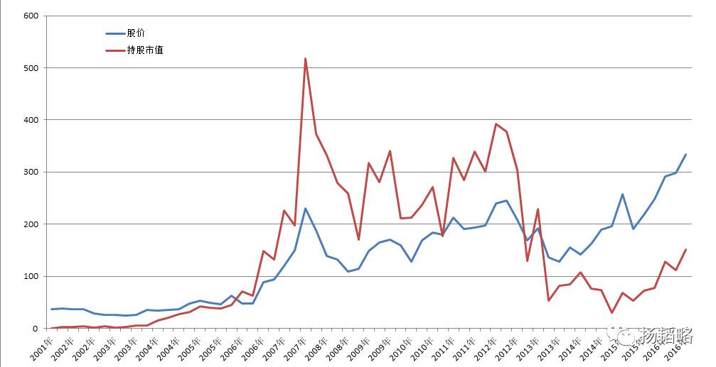 当然,持仓的基金数量却几经反复后持续上升。持仓机构家数最低的时间出现在2015年的一季度,当时只有59家机构持仓,且持股比例达到历史最低,只占当时流通股本的1.34%。而到2016年底,持仓机构达到552家,持股占比达到3.6%,仍处于很低的水平。