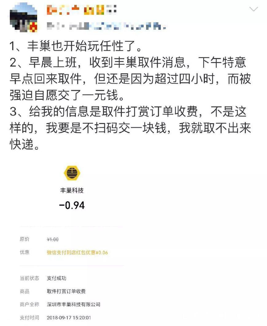 从违规的不告而放,到带有诱导性的打赏制度,丰巢之前的问题,在很大程度上被自提柜本身的便利性所掩盖。相比之下,近期的“收费升级”,可谓终于激起了让丰巢不可辩驳的质疑——中青在线报道,“原先丰巢只会在快递滞留24小时之后才会跳出“打赏”收费的二维码,现在存放8小时就跳了出来。之前明确是“求打赏”的页面,一看就知道不用付,现在变成了支付页面。”