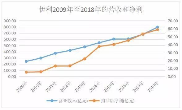 3、第三轮的股权激励则对伊利不温不火的股价又来了一次适时的刺激。我们可以看到,在这段期间,伊利的股价产生了再次走牛的趋势。其间对应的是伊利股份的营收和净利润等指标又开启了上行趋势。
