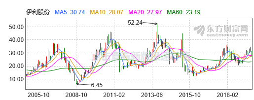 我们可以拉长伊利股份的K线图,来做个简要的分析。