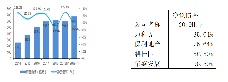 与此同时,荣盛的净负债率水平一直很高,可以看到,即便是比2018年同期有所下降,但净负债率水平依然在96.5%的高位,与万科、碧桂园等龙头差距显著。