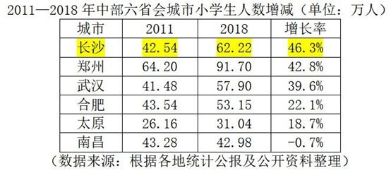 除了常住人口,我们再看一看人口增长的另一个关键指标,小学生人数增减量。2011—2018年,在中部六个省会城市中,长沙小学生人数增长率排名第一!