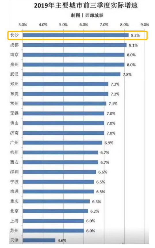 三季度经济数据出来了,GDP增速持续下滑,全国为6.2%,即便是强势城市深圳和杭州,今年前三季度GDP增速,也仅分别录得6.6%和6.7%。同期的长沙是多少?