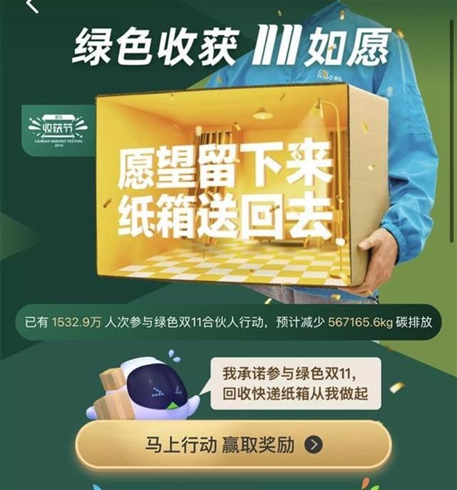值得一提的是,被视为“剁手经济”的天猫“双11”,今年成为了“绿色双11”——天猫官方发布的数据显示,11月11日当天有超2亿人次参与了绿色消费、绿色物流等环保行动,超过2000万人次加入成为“绿色合伙人”。