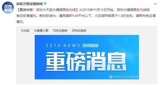 11月11日,深圳楼市出台大政策,大幅上调“豪宅线”,容积率高于1.0,建面144平米以下的房子全部列为普通住房,只要满两年出售就可以免缴增值税。