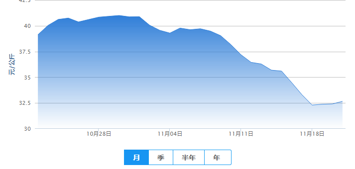 我们看到,外三元生猪价格从11月7日的39.71元每公斤连跌十一天,跌至11月18日的每公斤32.3元,内三元更是连跌十四天,从11月5日的每公斤38.62元跌至每公斤31.33元。