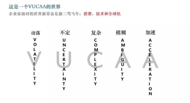 世界多变、不定、复杂、模糊,而且在加速,“它会越来越快,全部都加在一起,这就是我们企业生存的这样一个环境。”