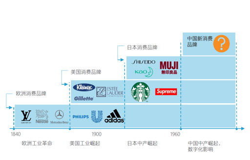 三是中国一定会出现全球化的消费的品牌,这是历史经验,也是拜新消费的机遇所赐。过去每一次的工业革命,从欧洲到美国到日本,都会诞生这个国家自己的而且是全球化的消费的品牌,中国的世界级的消费品牌在哪里?新的消费趋势下,可能会有一批新兴的消费品牌崭露头角。