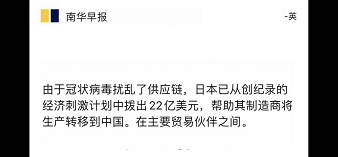 1,4月7日,日本通过史上最大规模的经济刺激计划。在这份近1万亿美元的经济刺激计划中,日本政府专门拨出22亿美元,鼓励日本企业将制造生产能力迁移出中国,以避免日本企业过于依赖中国的供应链。