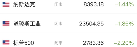昨天夜盘美股跌了,而且跌幅较大,纳斯达克、道琼斯工业和标普500,分别下跌了1.44%、1.86%和2.20%。
