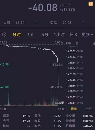 昨夜,美国原油(纽约轻质原油期货5月合约)暴跌300%,从开盘价18美元,一路雪崩式下跌,到0,到-,一直跌至-40.3美元,最终收盘价-37.63美元。